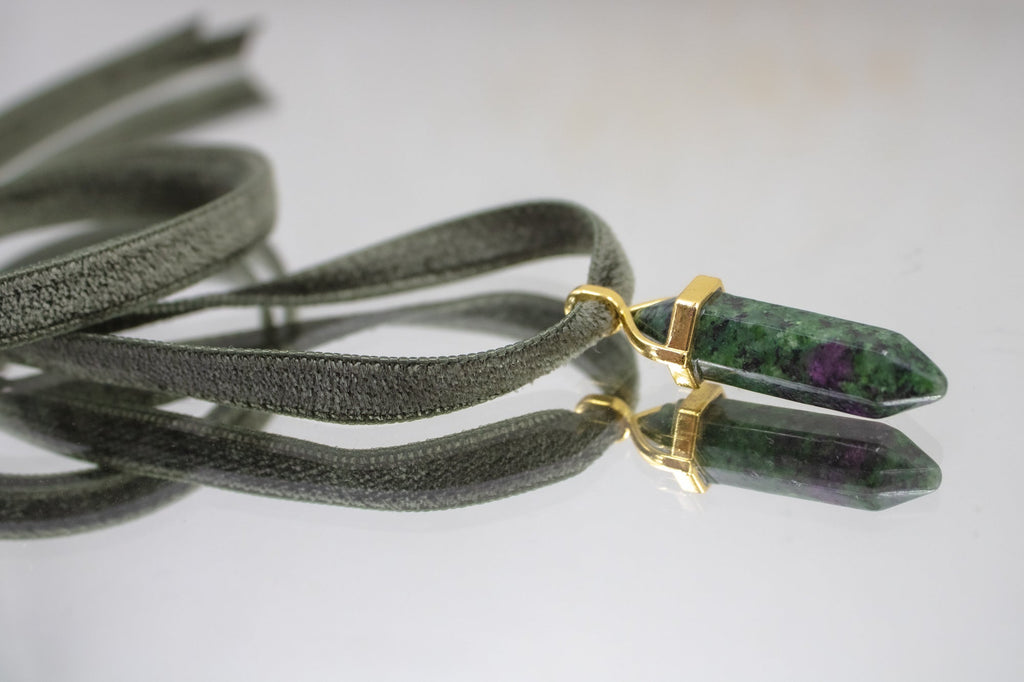 Le ruban de velours, doux et profond, enlace la peau comme une caresse ancienne. Il accueille des pierres naturelles — talismans de lumière et d’intention — suspendues en équilibre entre force et délicatesse.