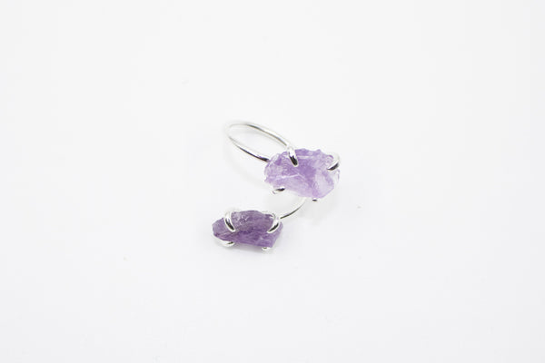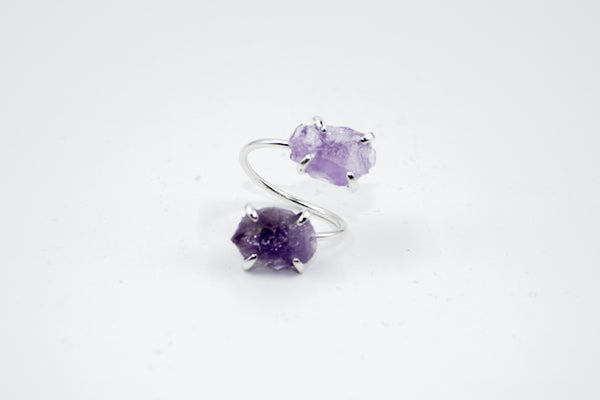 Équilibre et mystère s'entrelacent dans Arcane II, une bague ajustable en laiton argenté, qui unit deux pierres d’améthyste en vis-à-vis. Conçue comme une rencontre d’âmes, cette bague "toi et moi" incarne le lien invisible entre deux forces intérieures : la sagesse et l’intuition, le visible et l’invisible.