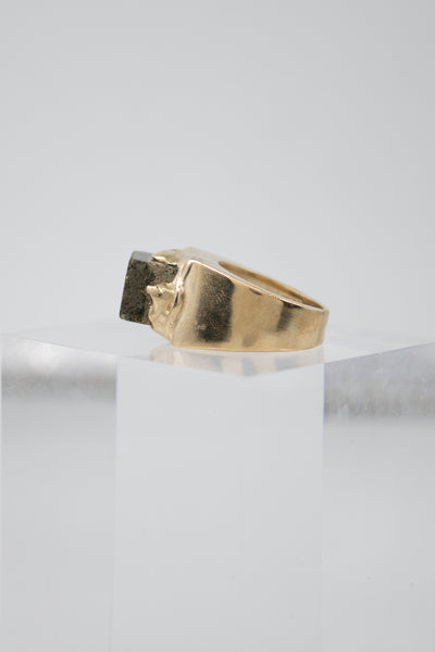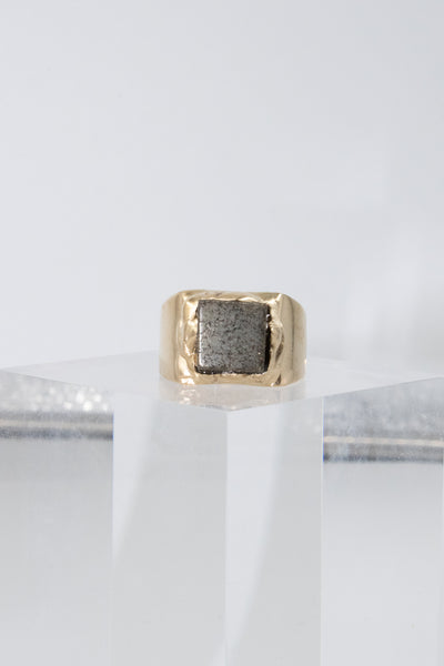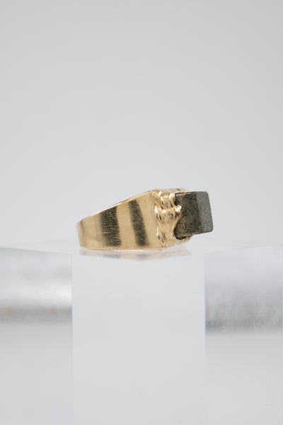 Montée sur une chevalière en laiton plaqué or, cette bague allie caractère et raffinement. Sa taille 54 en fait une pièce confortable à porter au quotidien, tout en affirmant une présence singulière.