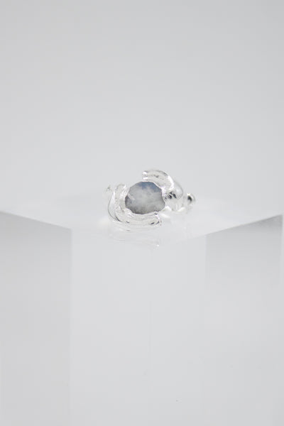 Au centre, une pierre de lune naturelle diffuse ses reflets doux et irisés. Symbole de féminité, d’intuition et d’harmonie, la pierre de lune favorise l’équilibre émotionnel et la connexion à ses ressentis profonds. Sa lumière subtile éclaire le chemin de ceux qui avancent avec patience et clairvoyance.