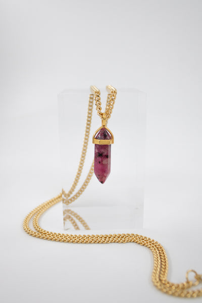 Le collier Joie associe un jaspe de Sésame rouge naturel. La chaîne gourmette de 3 mm de large mesure 70 cm, offrant un port élégant et léger autour du cou.