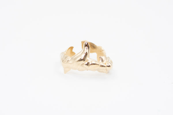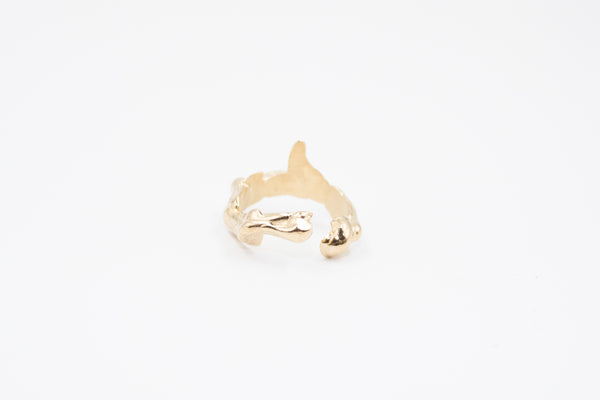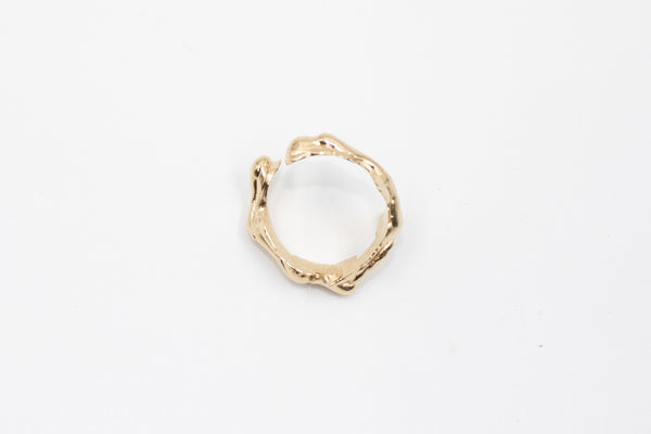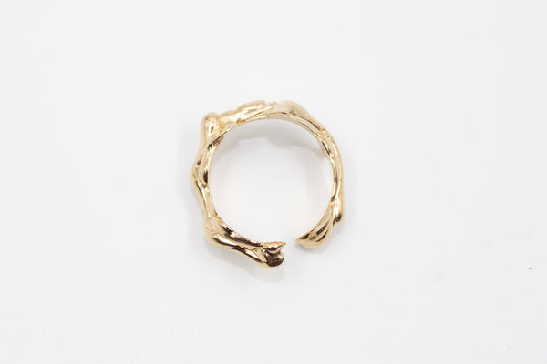 Pièce unique, sculptée comme un talisman, cette bague en laiton doré 24 carats épouse votre doigt grâce à sa taille ajustable.