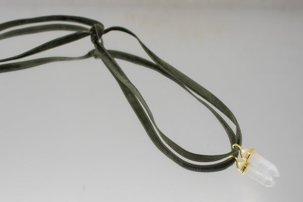 Le cristal de roche, pierre de clarté et d’harmonie, se suspend sur un ruban double face de satin fin — 8 mm de large, 70 cm de long — à nouer autour du cou tel un choker délicat.