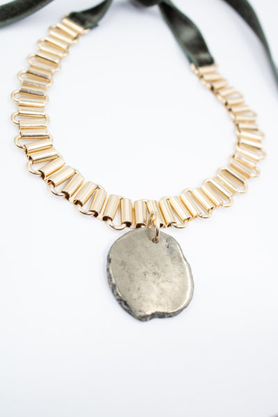 Suspendue à une chaîne tank dorée et nouée d’un ruban de velours profond, elle évoque l’équilibre entre puissance et douceur, mouvement et mémoire.