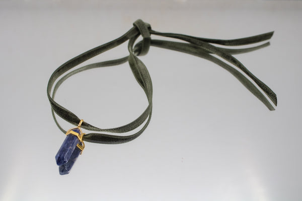La sodalite, pierre de sagesse et de sérénité, se suspend sur un ruban de velours double face fin (8 mm de large, 70 cm de long) à nouer autour du cou tel un choker délicat.